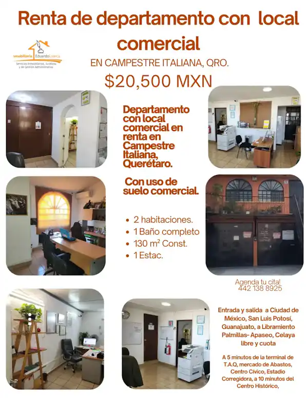 Se renta local comercial de 130 m² en la calle Masaccio, colonia Campestre Italiana, Querétaro. Ubicación estratégica en una zona con alta actividad económica, ideal para establecer tu negocio. Aprovecha esta oportunidad para posicionarte en una de las áreas más dinámicas de la ciudad. Contáctanos para más información y agenda tu visita.