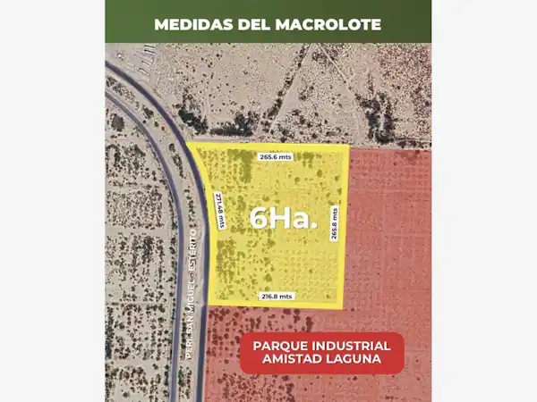 Gran oportunidad con vocación de desarrollo industrial.Ubicado en el polo industrial con mayor desarrollo en la laguna y a pie de boulevard de gran conectividad. Sus dimensiones son ideales para hacer más eficiente su lotificación o edificación de naves industriales. Tiene 271 m sobre la vialidad, dando así amplitud de imagen y fácil acceso.60,000 m² que ofrecen gran inversión, facilidad de desarrollo y una muy importante plusvalí...