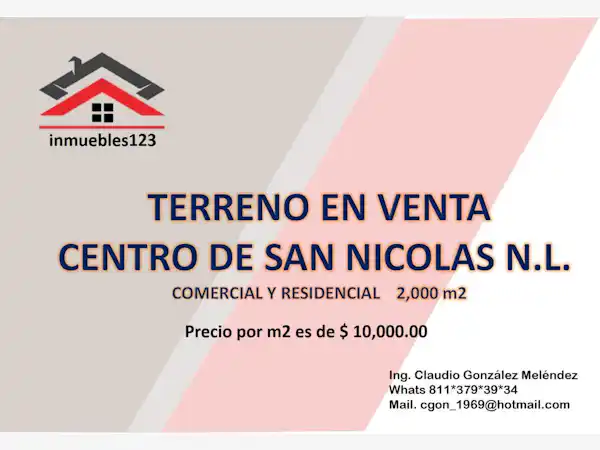 SE VENDE TERRENO COMERCIAL O INDUSTRIALCENTRO DE SAN NICOLAS EN ESQUINAAve de alto flujoCentro comercialLocalesEdificioSuperFarmaciaTiendasBodegasRestaurante BarSalón de eventos y másInversionistas para rentabilidadTerreno 2,000 m2Asesor Claudio GonzálezCel 8113793934Mail cgon_1969@hotmail.com